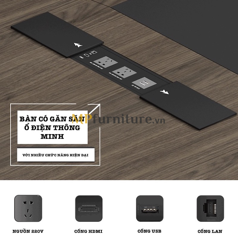 Chất liệu gỗ MFC, có gắn sẵn ổ điện thông minh trên bàn với các cổng kết nối như cổng nguồn điện 220V, công HDMI, Cổng USB, cổng mạng LAN