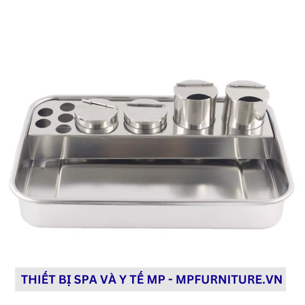 Khay inox kèm hủ đảm bảo an toàn cho spa, thẩm mỹ viện kèm 4 hủ dùng để đựng dụng cụ, bông, dao, ống thuốc.
