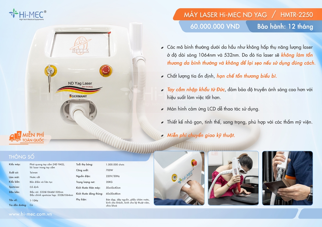 Máy Laser xóa xăm cao cấp Hi-MEC HMTR-2250 hoạt động dựa trên 3 bước sóng: 1064nm, 532nm và 1320nm.