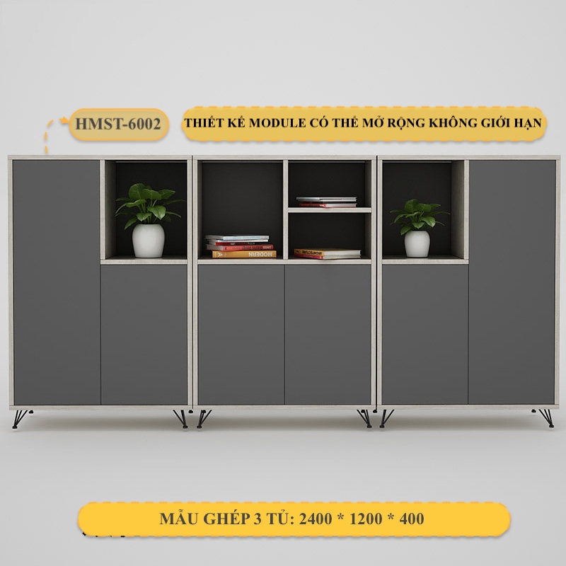 Tủ đựng hồ sơ văn phòng HMST-6002 có thiết kế dạng module với khả năng mở rộng hoặc thu hẹp để phù hợp với không gian văn phòng. Một bộ tủ thường bao gồm 3 tủ (tủ trái, tủ giữa và tủ phải) nhưng khách hàng có thể ghép thêm tủ với số lượng không giới hạn