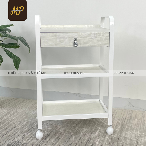 Xe đẩy dụng cụ cho spa với điểm nổi bật là mặt gỗ màu trắng có hình chìm bông hoa và kèm theo hộc tủ gỗ có khoá an toàn