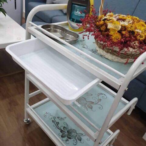 Xe đẩy spa mặt kính với khung xe bằng thép chắc chắn kết hợp với mặt kính cường lực cao cấp tạo sự sang trọng cho sản phẩm cũng như cơ sở spa